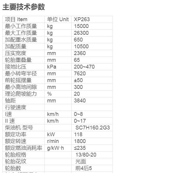 XP263型輪胎壓路機是根據(jù)市場要求而生產(chǎn)的大噸位輪胎壓路機,它以充氣輪胎為工作裝置對鋪層材料施以壓實,主要適用于瀝青路面、基礎(chǔ)層、次基礎(chǔ)層、大壩及填方工程等的壓實作業(yè),是建設(shè)高等級公路、機場、港口、堤壩及工業(yè)建筑工地的理想壓實設(shè)備。