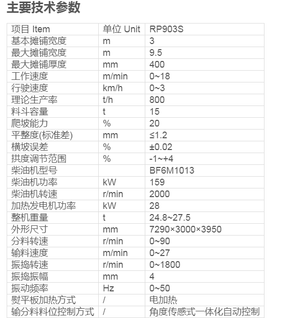 RP903S型瀝青混凝土攤鋪機(jī)是根據(jù)產(chǎn)品市場(chǎng)需求,以及我公司的攤鋪機(jī)現(xiàn)狀開發(fā)的一款9米高端大型攤鋪機(jī),是與德國VOGELE S2100-3、S1880-3為同一技術(shù)檔次產(chǎn)品,在部分技術(shù)上還處于領(lǐng)先的地位,主要適用于攤鋪瀝青混泥土面層施工,其最大攤鋪寬度可達(dá)9.5米,是高等級(jí)公路建設(shè)中重要的施工設(shè)備。