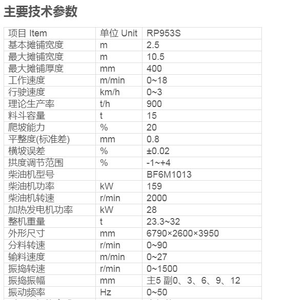 RP953S型瀝青混凝土攤鋪機(jī)是根據(jù)市場(chǎng)需求而決定開發(fā)的一種大型攤鋪機(jī),與目前國(guó)際最先進(jìn)的德國(guó)VOGELE S1880-3為同一技術(shù)檔次產(chǎn)品,在部分技術(shù)上處于領(lǐng)先地位,該產(chǎn)品主要適用于攤鋪瀝青混凝土面層,也可攤鋪二灰土、二灰碎石等基層材料,其最大攤鋪寬度可達(dá)10.5米,是高等級(jí)公路建設(shè)中重要的施工設(shè)備。