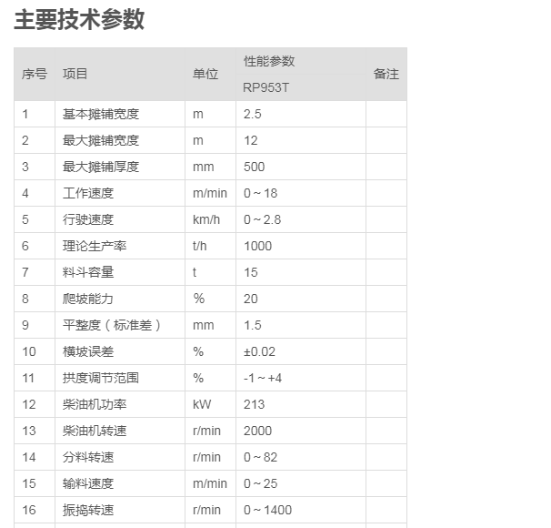 RP953T型攤鋪機是徐工大型攤鋪機中重要的機型,具有可靠的品質(zhì),超強的施工能力,優(yōu)異的工作性能和較高的性價比,是一種可廣泛應用于高速公路基層和各種等級公路面層材料攤鋪作業(yè)的施工設備,尤其適應于路基施工大厚度大寬度一次成型。該機采用全液壓驅(qū)動,微電腦控制,左右獨立驅(qū)動,超聲波料位傳感控制,雙振搗壓實等當今世界最先進技術(shù),配合獨特的結(jié)構(gòu)設計,使得該機具有超厚作業(yè)能力強,攤鋪穩(wěn)定性好,預壓密實度高,路面平整度好,操作簡單舒適,維修方便快捷等優(yōu)點,該機關(guān)鍵配套件采用進口元件,使得整機制造質(zhì)量和可靠性達到同類產(chǎn)品領先水平,是攤鋪基礎穩(wěn)定材料和lumina瀝青混凝土材料的理想設備。